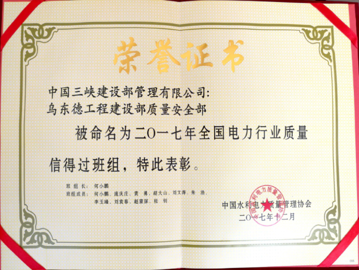本网讯(张钊)2017年12月15日,由中国水利电力质量管理协会主办的全国电力行业质量信得过班组评选活动结果揭晓,由三峡集团报送的乌东德工程建设部质量安全部(简称“质安部”),经过层层筛选,最终喜获“2017年全国电力行业质量信得过班组”荣誉称号。