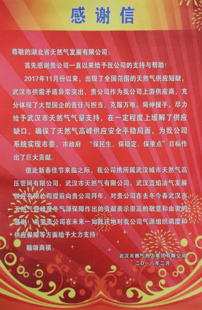 本网讯(姚晓普)“勇担保供责任、温暖武汉人民”。2月11日,武汉市天然气供应总体趋稳,取消居民限购措施,圆满完成“迎峰保供”工作,武汉市燃气热力集团将一封感谢信和一面鲜红的锦旗送到湖北能源天然气公司,感谢公司为武汉市去冬今春天然气迎峰度冬保障作出的贡献。