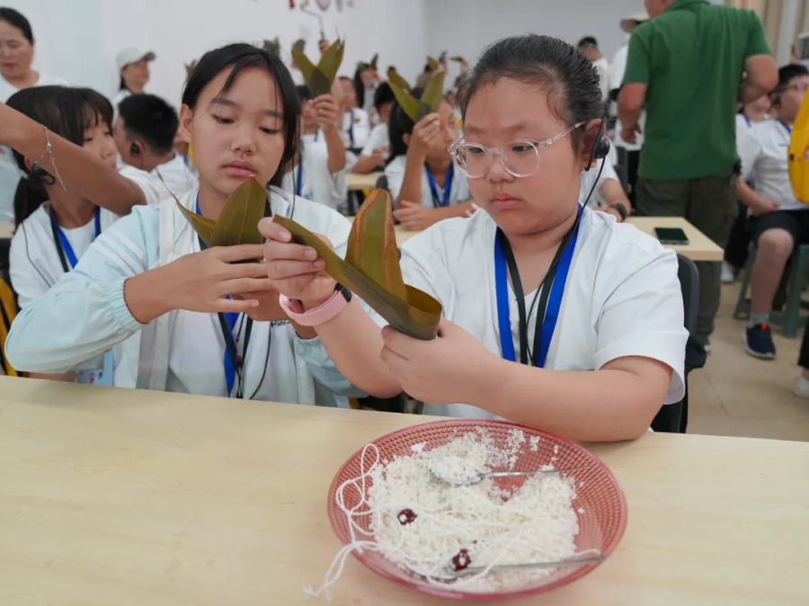 ▲ “三峡娃娃”在秭归体验包粽子