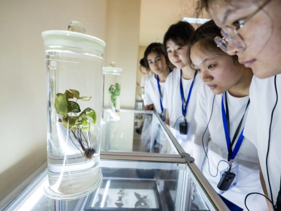 ▲ “三峡娃娃”在观察长江珍稀特有植物标本
