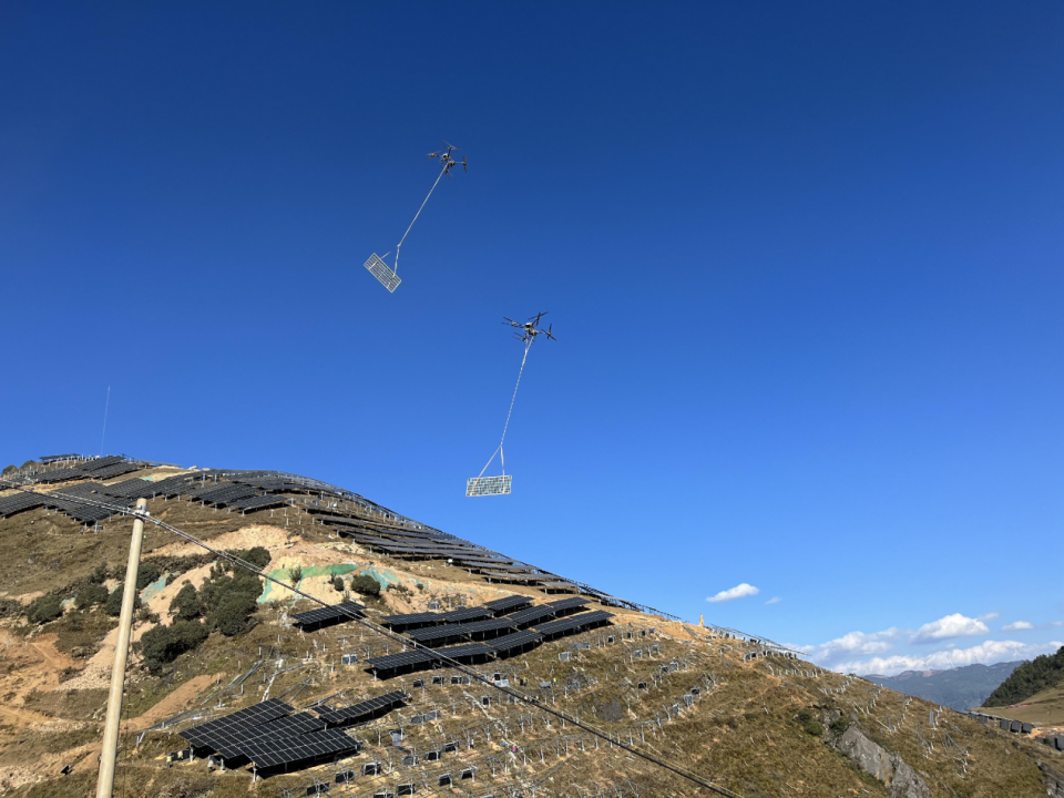 ▲凉山州会理330兆瓦光伏项目运用无人机运输光伏组件 三峡四川能投供图