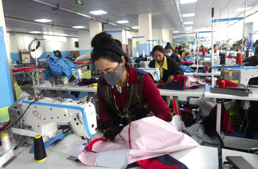 ▲厂房内藏族女工正在进行校服加工  摄影:刘艾菁