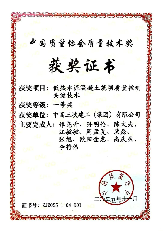 中国质量协会质量技术奖是经国家科技部、国家科学技术奖励工作办公室批准设立,由中国质量协会主办的科学技术奖励,是我国质量技术领域的行业最高奖项。三峡建工依托乌东德、白鹤滩等水电站工程建设,牵头研发低温升、高抗裂的混凝土关键技术,构建标准化质量控制工艺,攻克大坝防裂等行业难题,为同类工程提供可推广经验。此次获奖既是对三峡建工技术创新实力的高度印证,更是对“建设精品工程”初心的有力回响。