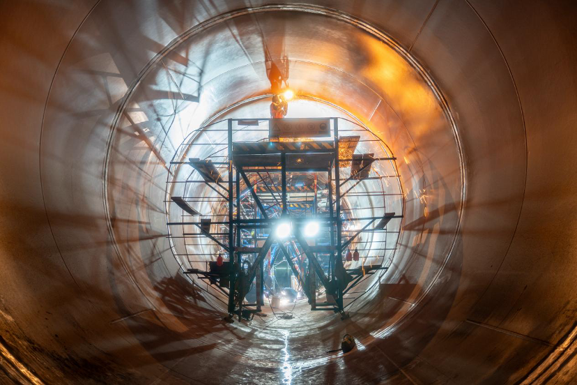 ▲引水中平洞焊接完成的1000兆帕压力钢管内部 三峡建工供图
