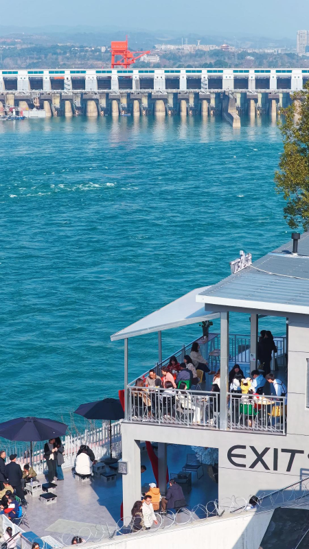 阳光明媚,江水湛蓝,银白色的葛洲坝工程横卧江中,滔滔江水拍打着江边岩石,激起白色浪花。生态步道上人流如织,或悠闲散步,或带娃嬉戏,或牵着爱犬漫步,阳光晴好,周边不少游客来此处拍照打卡。