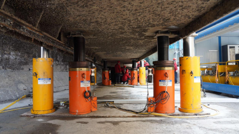 ▲ 图为人字门同步升降系统与机械保顶系统正在对葛洲坝二号船闸人字门进行顶升 摄影:陈臣