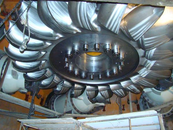 哈萨克斯坦玛依纳水电站装机容量为2×150MW,水轮机为立轴冲击水斗式水轮机,最大出力为168.85MW,最大水头521.7m,额定水头471.4m,转轮节园直径:3500mm,最大外圆直径4422 mm,射流直径290mm,水斗最大宽度997 mm,水斗数21个,喷嘴数6个,是目前亚洲功率最大的冲击式水轮机,单重32吨。