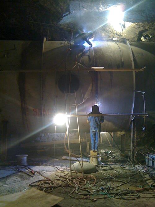 玛依纳水电站引水隧洞从高程1718.5米至1248米,全长9230m,由上平段、竖井段和下平段构成。其中,上平段全长4912m,采用钢筋混凝土衬砌;竖井及下平段压力管道全长4318m,竖井段采用壁厚18-38mm的16MnR钢管回填混凝土衬砌,下平段采用壁厚28-42mm的WDB620高强钢管回填混凝土衬砌。