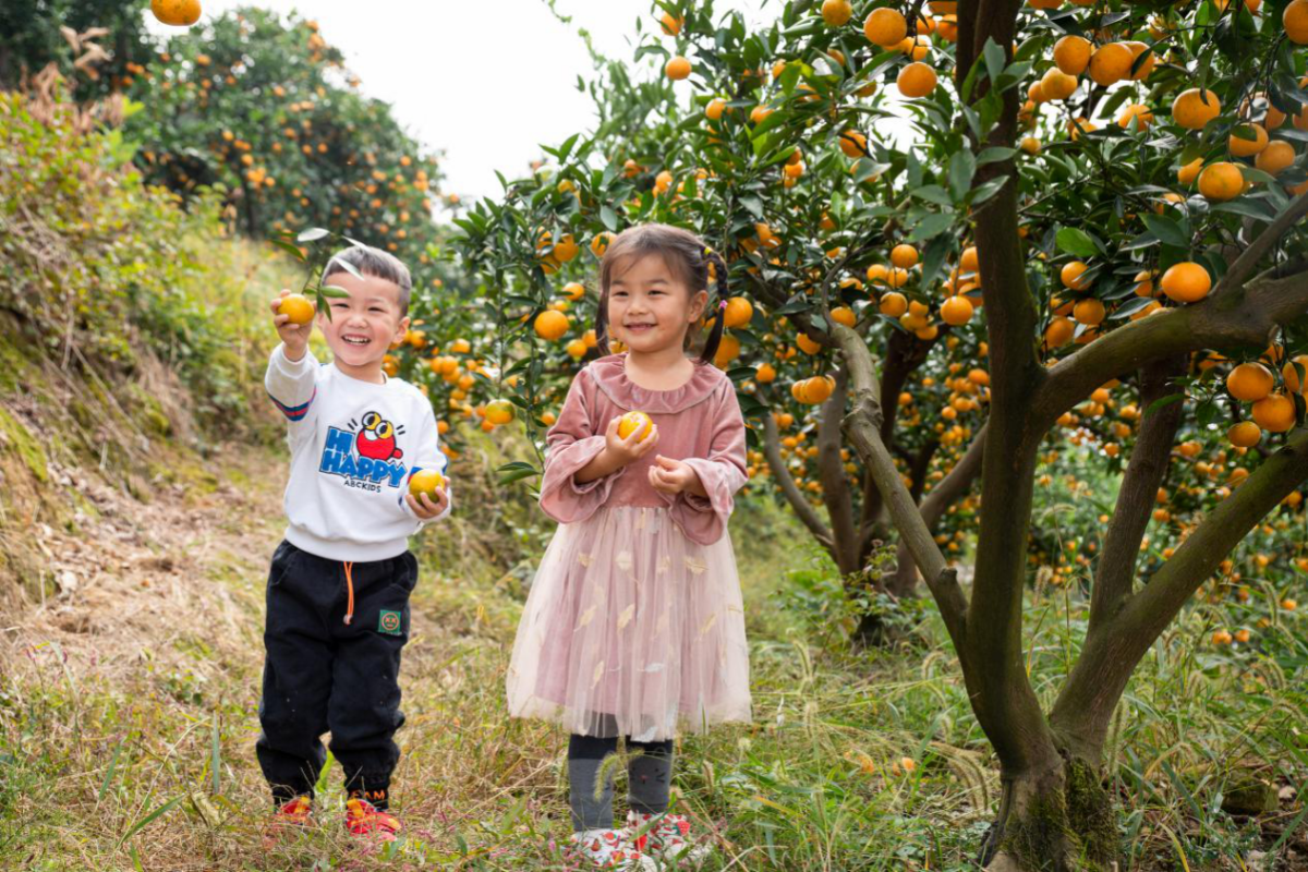 柑橘园里,孩子们正在采摘柑橘 天平山村村委会提供