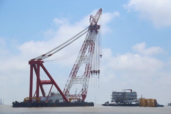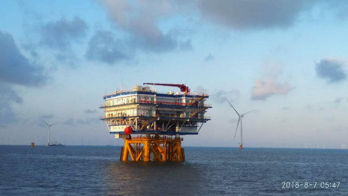 江苏大丰项目位于江苏省盐城市大丰区东沙沙洲北侧的小北槽—太平沙海域。项目海上升压站成功吊装是继5月30日全面进入风机吊装阶段之后又一里程碑式节点。其海上升压站整体结构布局及区域功能设计合理,技术先进,并首次实现了电气一次主设备完全国产化。