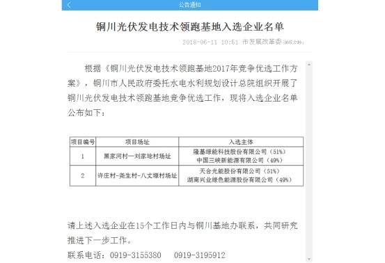 6月11日,根据铜川市技术领跑者光伏基地办公布的铜川光伏发电技术领跑基地入选企业名单,经激烈角逐、层层筛选,技术比对,三峡新能源与隆基绿能科技联合体成功中标铜川市250兆瓦光伏技术“领跑者”项目。
