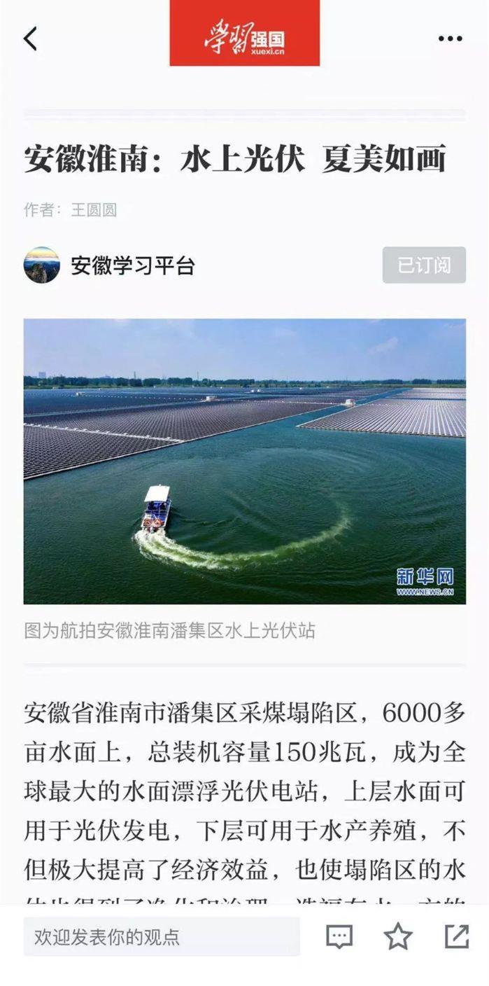 学习强国平台、新华网、凤凰网、安徽国际频道等打卡三峡新能源安徽淮南150兆瓦水面漂浮光伏电站,一起跟随镜头,看看他们眼中的淮南水面光伏电站~