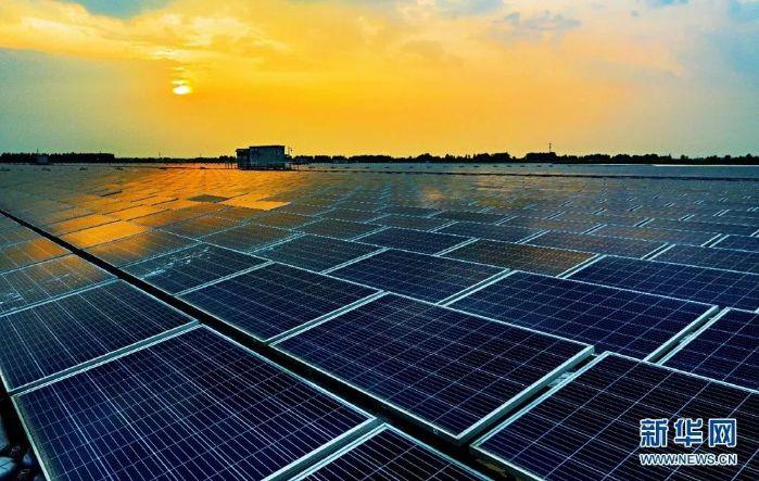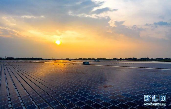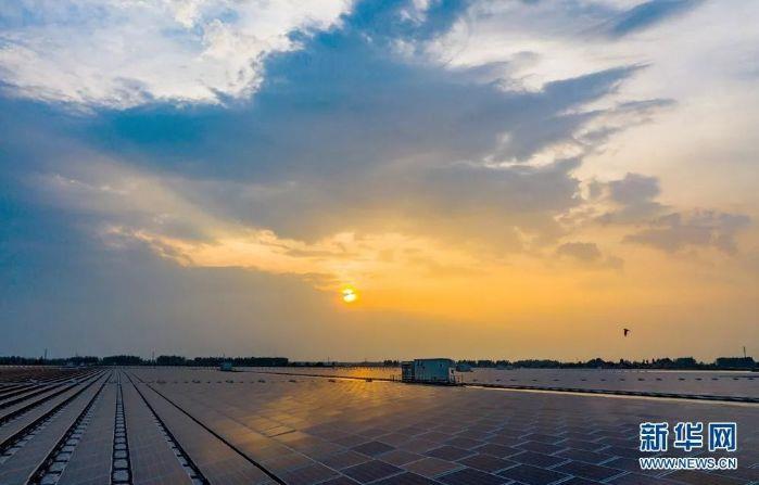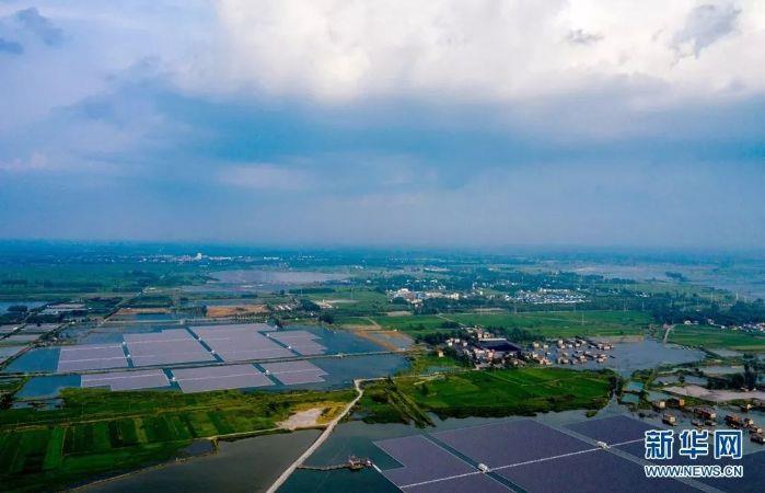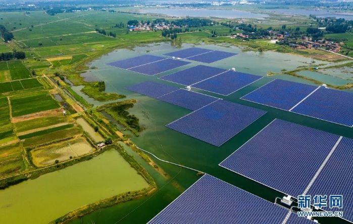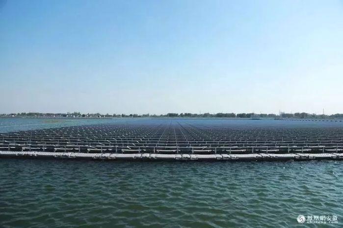 安徽省淮南市潘集区采煤塌陷区,6000多亩水面上,总装机容量150兆瓦,成为全球最大的水面漂浮光伏电站,上层水面可用于光伏发电,下层可用于水产养殖,不仅提高了经济效益,也使塌陷区的水体得到了净化和治理,造福在水一方的百姓。蓝天、白云、水面漂浮的光伏形成一道靓丽的景色。