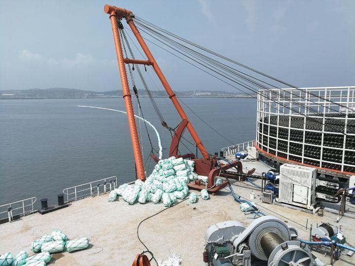 为确保如期完成海缆敷设工作,项目团队充分利用有限的施工窗口期,单根海缆敷设采取24小时不间断施工方式。海缆敷设施工前,精心组织相关单位对海缆敷设环节的安全隐患和外部风险进行了充分的研判和评估,并制定相关的应急预案。海缆敷设施工过程中,会同监理单位、生产厂家相关人员全程现场旁站监督,采用水下超短基线定位系统(USBL)来精确定位海缆路由,确保海缆敷设质量受控。同时,高度重视施工期间海洋环境保护工作,严格管控施工单位生活和工业垃圾处理,严禁甲板油污直接冲刷入海,最大限度降低施工海域生态环境影响。