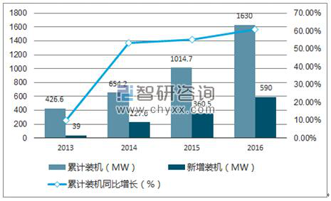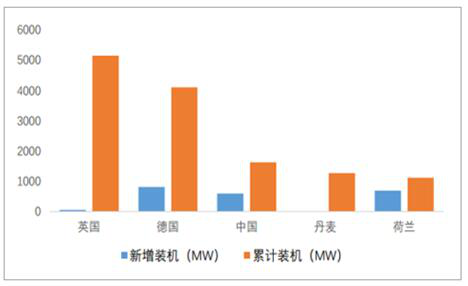 随着海上电价政策的明确,建设成本的持续优化以及配套产业的日渐成熟,我国海上风电在“十三五” 期间迎来加速发展期,规划目标是到 2020年确保并网 5GW,力争开工 10GW。截至 2016 年底我国海上风电累计装机容量为 1.63GW, 预测未来三年半新增海上风电并网将达 3.37GW 以上,新增海上风电项目开工 8.37GW 以上。2016 年我国海上风电累计装机容量超过丹麦排在全球海上风电累计装机榜单第三位,紧随英国和德国。