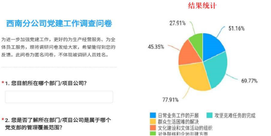首次采用“问卷调查”的方式对党员所发挥的作用和改进的方向进行了调查,让群众“把脉”、让支部“拿方”,调查覆盖了2020年2月前进入公司的所有群众员工。其结果显示,群众对党员在疫情中发挥带头作用满意率达到100%,而党员在日常业务能力和难点问题解决、党组织作用发挥等方面仍有不足。为今年党建工作的开展指引了方向,也提供了思路,实现了“问题为导向”。