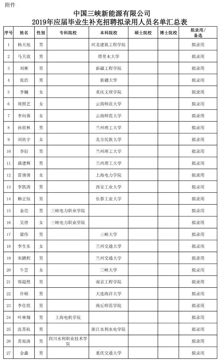 附件:中国三峡新能源有限公司2019年应届毕业生补充招聘拟录用人员名单汇总表