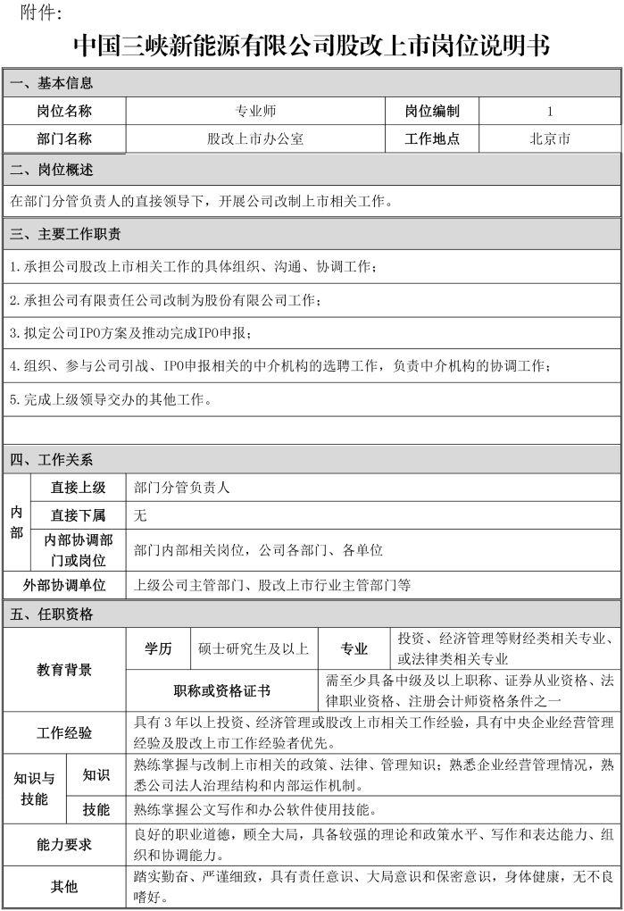 为加强中国三峡新能源有限公司股改上市工作力量,加快股改上市工作进程,现面向公司外部招聘股改上市管理岗位1人,具体岗位职责及任职资格条件见《招聘岗位说明书》(附件)。